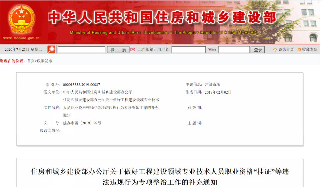 2018年11月22日,住建部等國家七部委聯合下發《住房城鄉建設部辦公廳等關于開展工程建設領域專業技術人員職業資格“掛證”等違法違規行為專項整治的通知》(建辦市〔2018〕57號),正式拉開“掛證”專項整治大幕。其中明確指出: