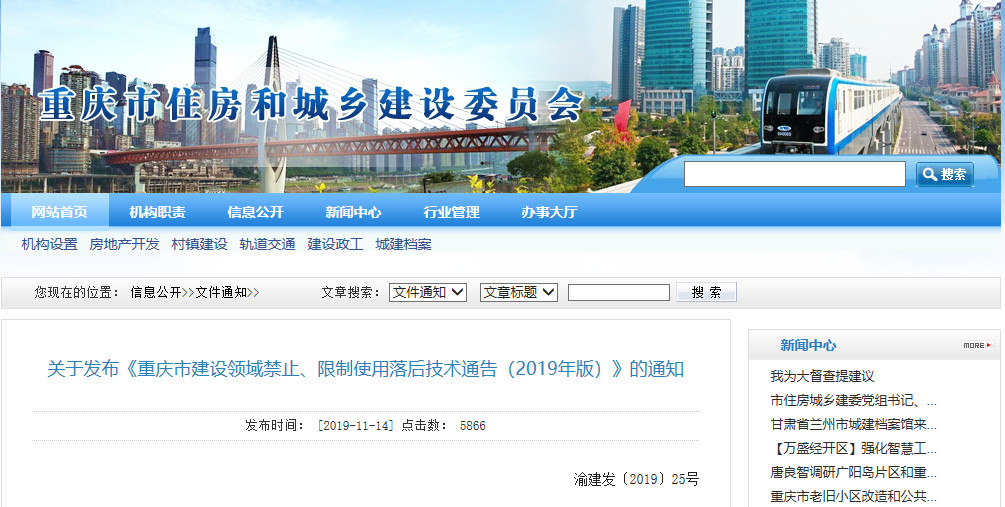 關(guān)于發(fā)布《重慶市建設(shè)領(lǐng)域禁止、限制使用落后技術(shù)通告(2019年版)》的通知