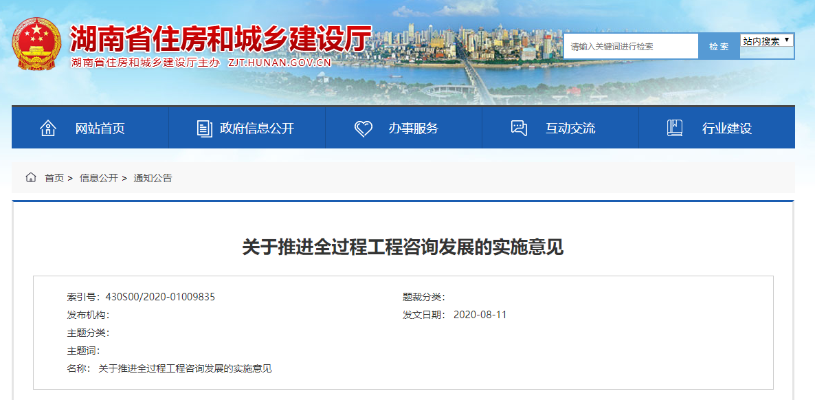 8月11日,湖南省住建廳發布《關于推進全過程工程咨詢發展的實施意見》。