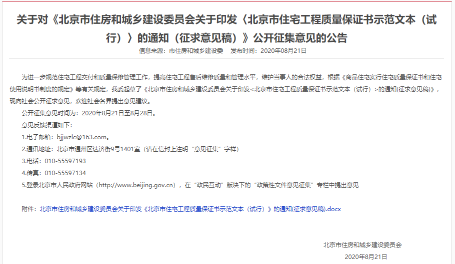 未來,購房人在辦理新房收房手續時,除了《竣工驗收備案表》外,還得記得讓開發商提供質量保證書。8月21日,北京市住建委發布《關于印發〈北京市住宅工程質量保證書示范文本(試行)〉的通知(征求意見稿)》的公告,并面向社會就《北京市住宅工程質量保證書示范文本(試行)》公開征求意見。
