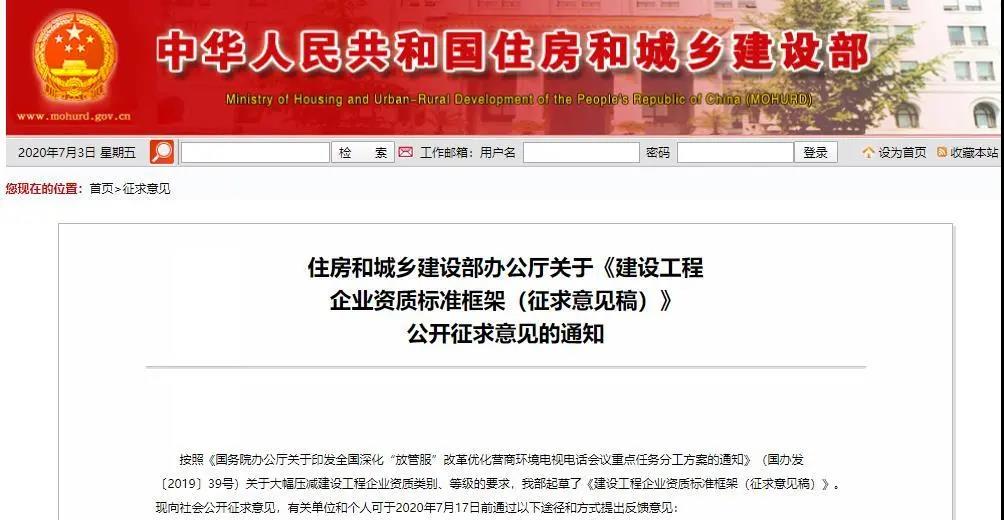 7月2日,住建部發布《住房和城鄉建設部辦公廳關于<建設工程企業資質標準框架(征求意見稿)>公開征求意見的通知》,在通知中明確: