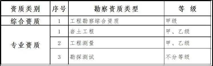 保留綜合資質。將4類專業資質及勘察勞務資質整合為巖土工程、工程測量、勘探測試等3類專業資質。專業資質等級壓減為甲、乙兩級(勘探測試專業資質不分等級),原丙級資質并入相應專業乙級資質。