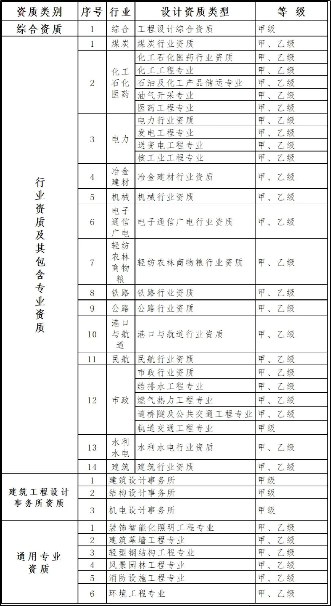 保留綜合資質。對部分行業資質進行整合,其中,冶金行業與建材行業合并為冶金建材行業資質,輕紡行業、農林行業、商物糧行業合并為輕紡農林商物糧行業,電子行業、通信行業、廣電行業合并為電子通信廣電行業,石油天然氣行業并入化工石化醫藥行業,軍工行業并入機械行業,核工業行業并入電力行業,資質等級壓減為甲、乙兩級,原丙級資質并入相應行業乙級資質。取消海洋行業及專業資質,相關企業可以換發相近行業資質。整合原化工石化醫藥、石油天然氣、電力、市政行業中的專業資質,資質等級壓減為甲、乙兩級,原丙級資質并入相應專業乙級資質;取消其他行業的專業資質,并入相應行業資質,原甲、乙級專業資質并入相應等級的行業資質,原丙級專業資質并入乙級行業資質。將專項資質調整為通用專業資質,取消環境工程專項資質的5個專項類別,整合為環境工程專業資質,資質等級壓減為甲、乙兩級,原丙級資質并入相應專業乙級資質。保留3類事務所資質。