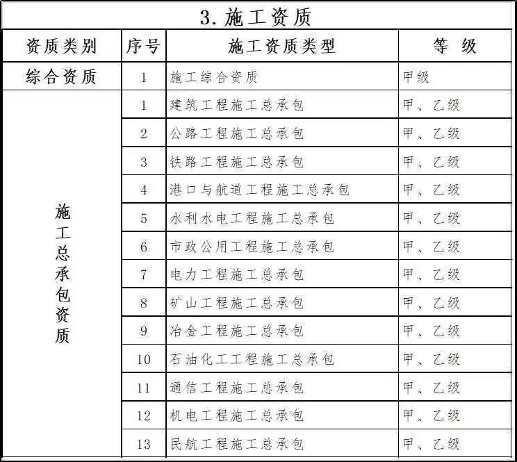 將施工總承包特級資質調整為施工綜合資質,取得原10類施工總承包特級資質中的任一類,即可換發綜合資質。取得綜合資質的企業,可承擔各類別、各等級施工總承包業務,不再申請或持有其他施工資質。