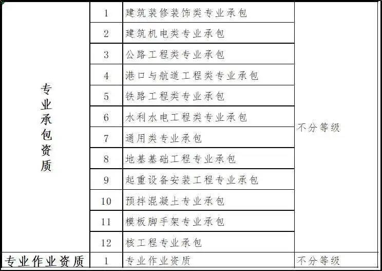 保留地基基礎工程、起重設備安裝工程、核工程等專業承包資質;將原專業承包資質整合為建筑裝修裝飾類、建筑機電類、公路工程類、港口與航道工程類、鐵路工程類、水利水電工程類、通用類專業承包資質;專業承包資質不分等級。